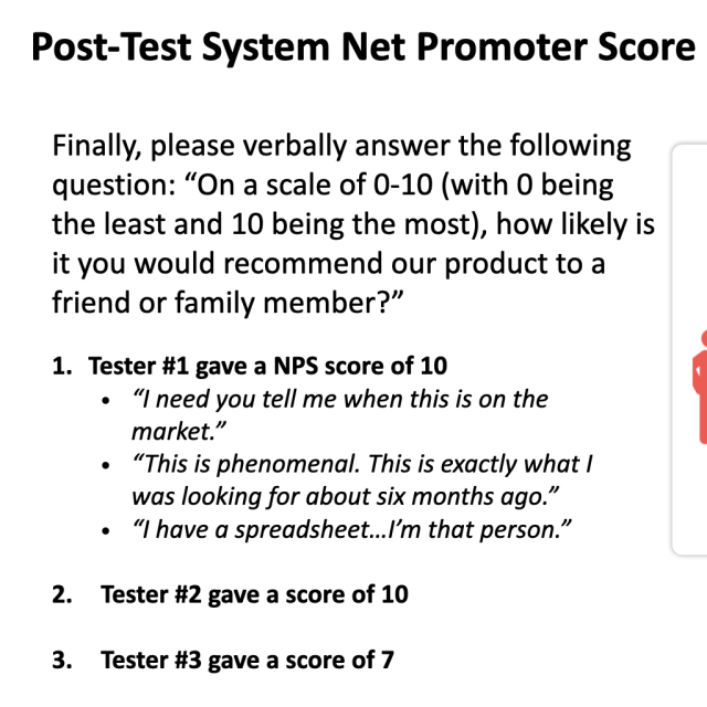 Some of the qualitative feedback we received included "I need you to tell me when this is on the market" and "This is phenomenal. This is exactly what I was looking for about six months ago." The quantitative feedback showed us a task success rate of 85%, an overall net promoter score of +30 and a system usability scale overall score of 90.8. In a short few weeks working remotely with each other we were able to create a web application that is viable and would flourish on the market.