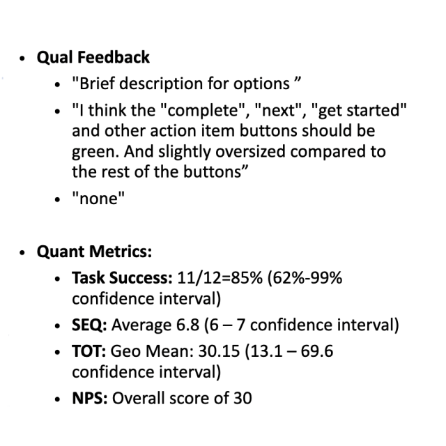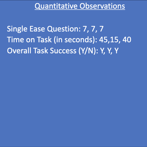 Through these user tests we formed qualitative and quantitative observations. The qualitative observations came from the users thinking out loud and my teammates and I watching the users as they went through the assigned tasks at hand. The quantitative observations came from asking the single ease question (on a scale of 1-10 how easy was this task), the time on task observation (how long in seconds it took the user to complete the task), and the overall task success (did the user complete the task yes or no). We also asked the users to give the overall application a net promoter score; “On a scale of 0-10 (with 0 being the least and 10 being the most), how likely is it you would recommend our product to a friend or family member?”