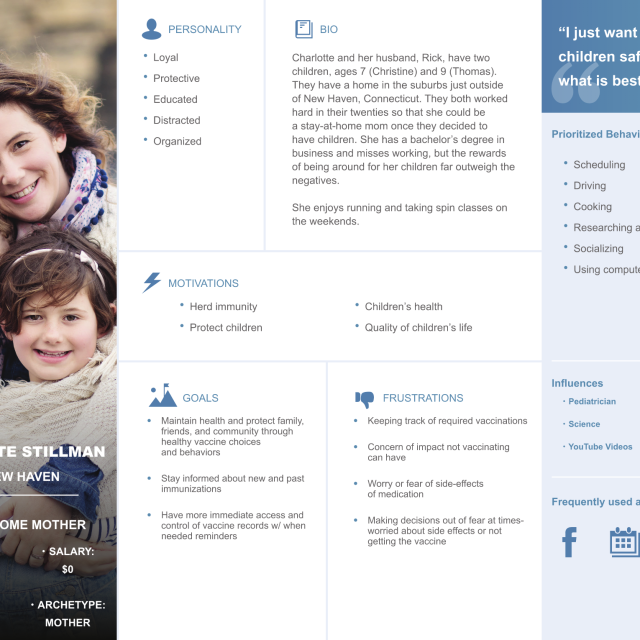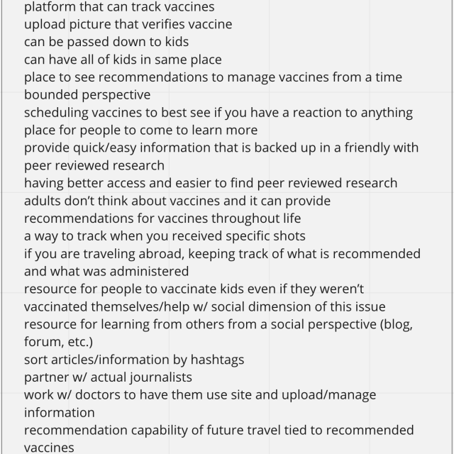 We created a survey, conducted interviews, created a persona, worked through ideation, created user story maps, solution ideatoin, low-fi wireframing, prototype creation, usability testing, design iteration, hi-fi wireframing and prototyping. All of this helped us to realize that there was a gap in the market in terms of tracking and organizing vaccines. Moving forward with the project, that aspect became the biggest feature of our web app.
