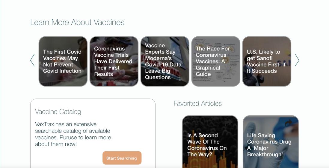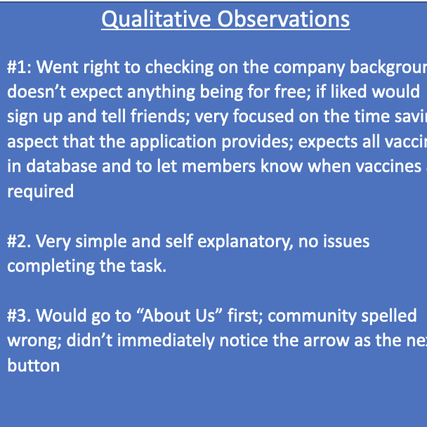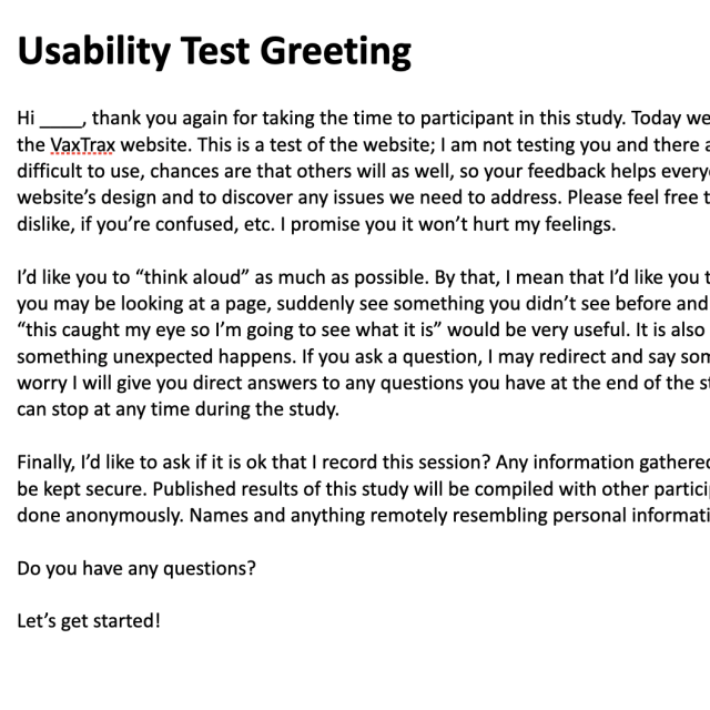 Our research goal was to observe and improve the overall VaxTrax website user experience. To do that we conducted formative usability testing to identify problems that needed to be improved. We observed participants conducting a variety of typical tasks while using the VaxTrax website and gathered real-time feedback for iterative design updates. We developed short and long-term solutions to improve the overall experience.