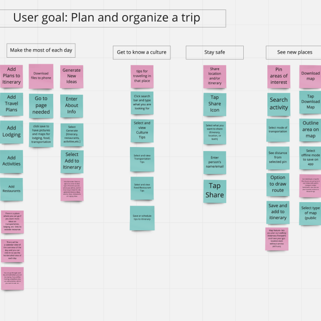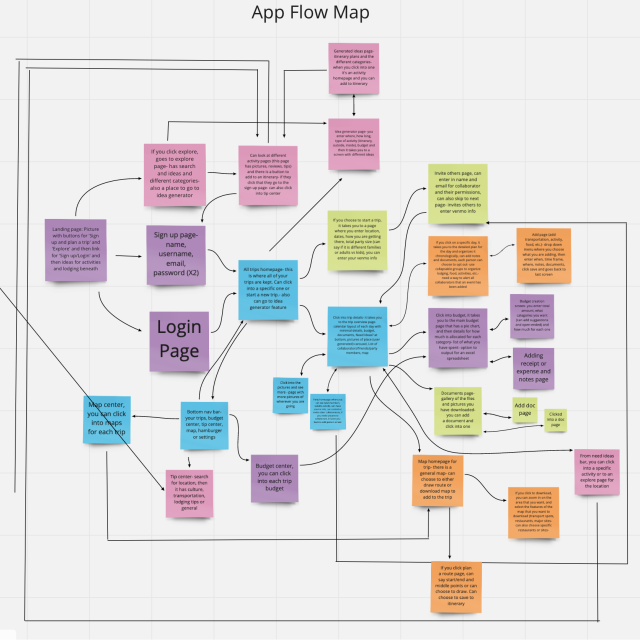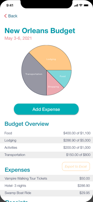 We created a survey, conducted interviews, created a persona, worked through ideation, created user story maps, solution ideatoin, low-fi wireframing, prototype creation, usability testing, design iteration, hi-fi wireframing and prototyping. Through this we were able to realize that budget was a very desirable feature for planning a trip. Moving forward with the project, that aspect became the biggest feature of our mobile app. We had to trim down our features to MVP so as to not over-reach during our short time working on this app, but budget remained as it was so important to our users.