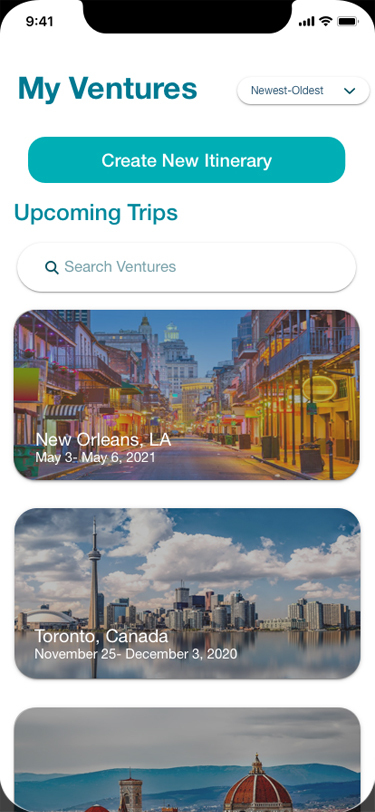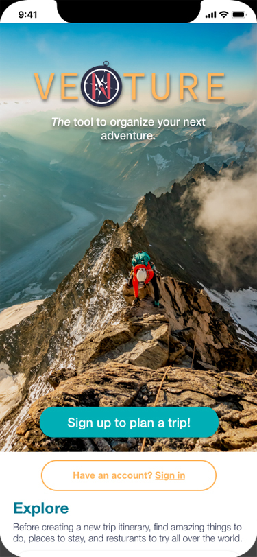 This hi-fi prototype is the entire Venture mobile application experience. From this app, a user can create an account, log in, plan a new trip, view an upcoming trips details, such as budget and plans, and collaborate with other users. Click the image at the left to open a new window with the prototype.
