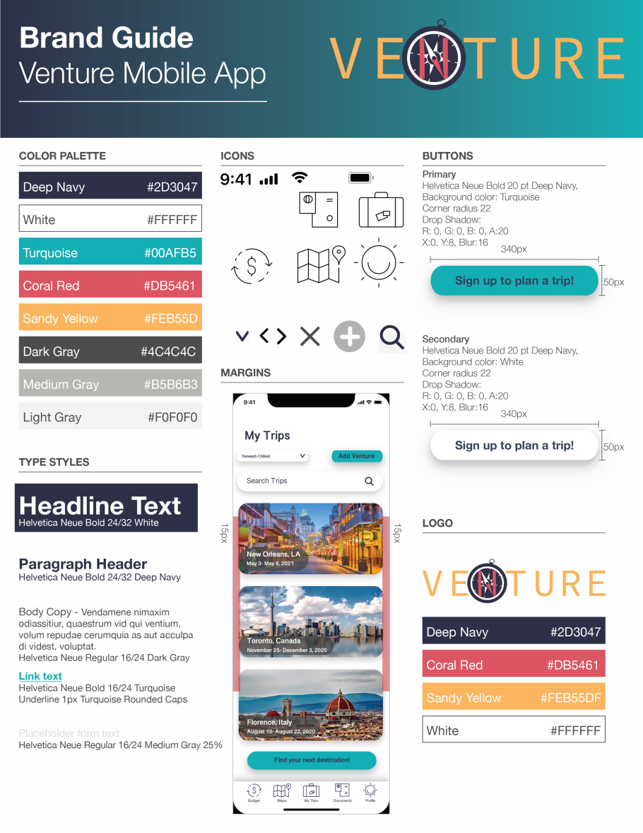 This was a project that had several screens to it. As a group we decided to divvy the screens up and each revamp several screens as we took this project from low-fi to hi-fi wireframes. As the team lead in UI and visual design, I drafted a brand guide that acted as a growing document for us as we worked. I chose & defined the color palette, type styles, icons, margins, buttons and designed the logo. Once this document was drafted, each of us were able to work on our own set of screens while maintaining consistency and an overall cohesive design. Some elements did change as we worked, but I gave the overall finished mobile app a final pass to make sure it held up to our brand guide before we presented it to the class. Click the image at the right to view full size.