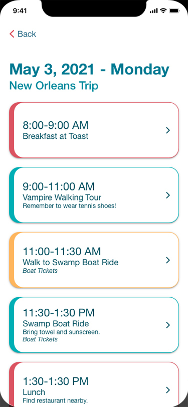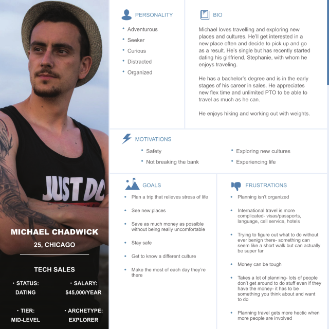 Some of the qualitative feedback we received included "good tracker and planning app; easier than using excel sheet" and "It was easy to know where you were and what you were looking for. It was good to be able to upload your documents so you don’t have to carry them around all the time. It also was good to have reviews and suggestions to find out the best trip." The quantitative feedback showed us a task success rate of 95%, an overall net promoter score of +23 and a system usability scale overall score of 76.4. In a short few weeks working remotely with each other we were able to create a mobile application that still needs some further refinement, but adds a great tool to the travel market.