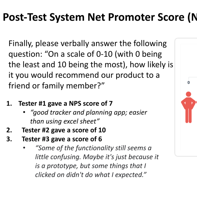 Through these user tests we formed qualitative and quantitative observations. The qualitative observations came from the users thinking out loud and my teammates and I watching the users as they went through the assigned tasks at hand. The quantitative observations came from asking the single ease question (on a scale of 1-10 how easy was this task), the time on task observation (how long in seconds it took the user to complete the task), and the overall task success (did the user complete the task yes or no). We also asked the users to give the overall application a net promoter score; “On a scale of 0-10 (with 0 being the least and 10 being the most), how likely is it you would recommend our product to a friend or family member?”